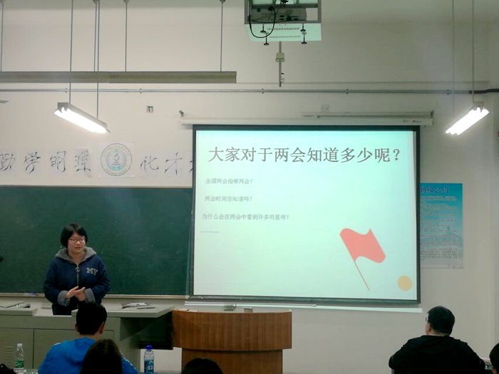 本网讯(2018级化学(非师范)专业 陈浩天)3月20日晚,化学(非师范)专业在行知楼7栋304室开展了两会学习主题班会,并进行了团支部推优。班会由团支书徐千千,班长樊远路共同主持,班级全体同学及辅导员程紫丹老师共同参加了本次班会。