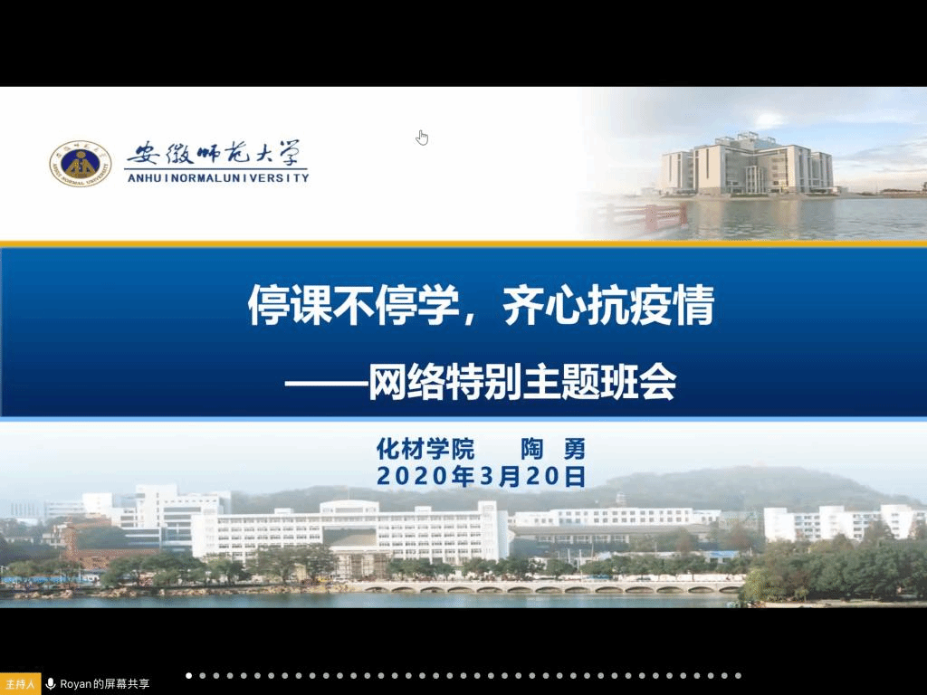 本网讯(18材料化学 吴晨曦)2020年3月20日晚八点,在辅导员陶勇主持下,2018级材料化学、应用化学和化学中外班召开了一场“停课不停学,齐心抗疫情”线上直播主题班会。