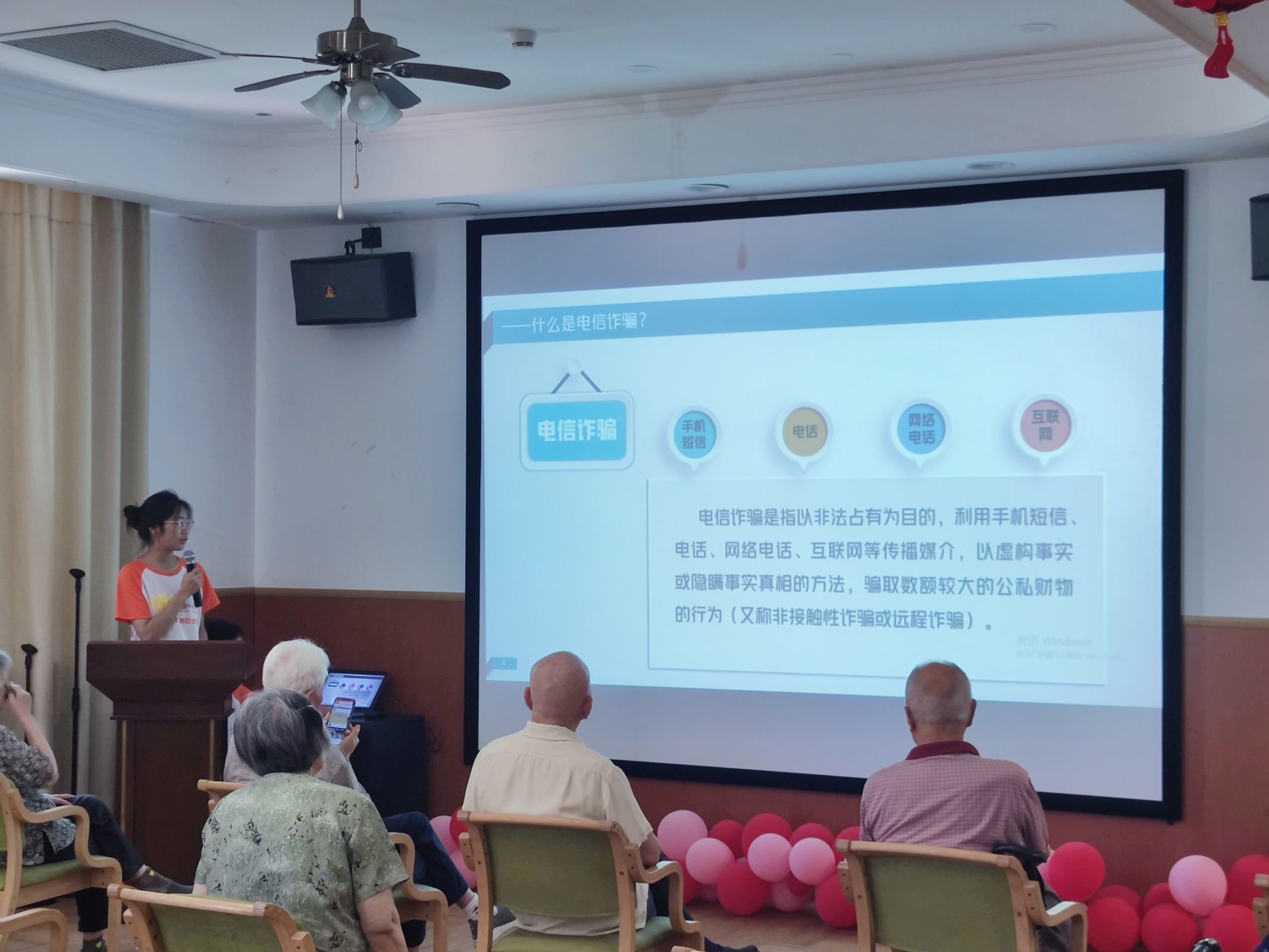 活动第三天,团队在颐养院为老人们开展了主题为“健康生活”和“防范电信诈骗”的宣讲活动,目的是围绕与老人们生活息息相关的内容向老人们进行一些健康生活和电信诈骗等注意事项的知识科普,从而提升老人们的生活品质、保障老人们的利益。宣讲过程中,宣讲成员激情澎湃、声情并茂,并结合具体生动的案例和图文为老人们细心讲解,老人们听得也很认真投入,宣讲取得了不错的效果。