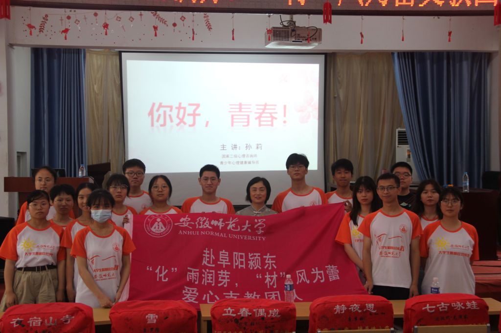 本网讯(化材学院 张讷言)为了关注青少年心理健康,培养青少年应对青春期变化的正确态度,化材学院“化雨润芽,材风为蕾”支教团队于7月6日上午10时在阜阳市新乌江镇中心学校报告厅举办了“你好,青春”主题讲座。阜阳十中国家二级心理咨询师孙莉、支教团队全体队员、新乌江镇中心学校全体七年级学生参加了本次活动。