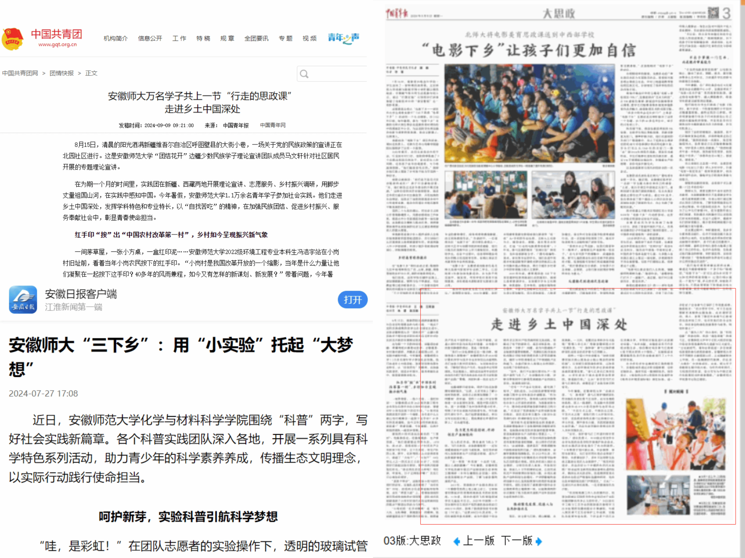 据悉,在大学生护航行动计划背景下,化材学院高度重视大学生“三下乡”暑期社会实践工作,今年共有25支队伍647人参与社会实践,其中3支国家级重点团队,12支校级重点项目。据统计,媒体宣传总计369篇,国家级媒体宣传文章达18篇,省级媒体宣传文章24篇,市级媒体宣传27篇,通过社会实践展现了化材青年学子积极向上的精神风貌与强烈的社会责任感,推动广大学生在实践中锻炼自我、提升能力。