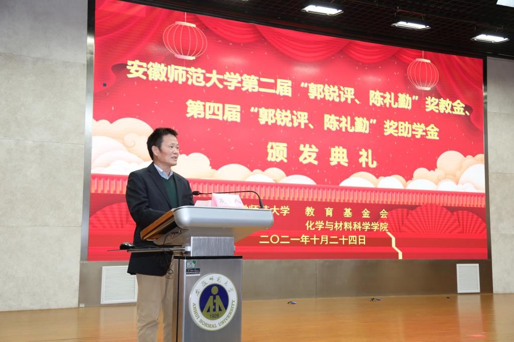 活动在庄严的国歌中拉开序幕。郑金泽首先宣读了《关于颁发安徽师范大学第二届“郭锐评、陈礼勤”奖教金、第四届“郭锐评、陈礼勤”奖助学金的决定》。嘉宾们分6个批次共15组向获奖师生、受助学生颁发奖教金、奖助学金获奖证书。2018级材料化学专业黄宁宁和2019级化学(师范)专业沙凝分别代表获奖、受助同学发言,两位同学对郭锐评女士、陈礼勤博士的无私资助表达了诚挚的敬意,并向学校、学院老师和同学们的关心表达了感谢。两位同学表示将怀揣感恩之心,以更加优异的成绩来回报郭锐评女士、陈礼勤博士及学校学院给予的关心和帮助,并努力将这份大爱精神传承下去,奉献爱心,回馈社会。